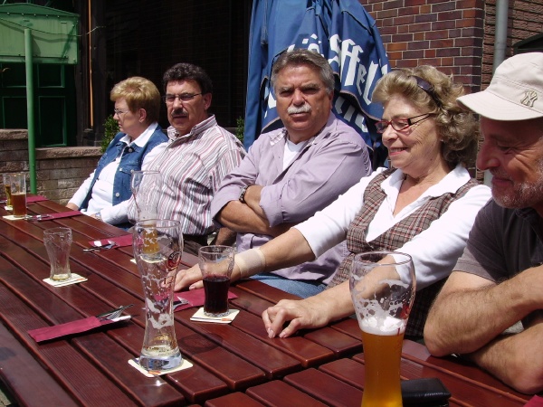 So mit Tempo 70 als Letzter hinter dem Fahrzeugtross herzockelnd, habe ich allerdings reichlich Gelegenheit, den Blick schon mal nach links und rechts schweifen zu lassen. Dabei kann ich den den Charakter der Landschaft mit meinen Augen aufnehmen. Weit im Westen zeichnen sich die nördlichen Ausläufer der Ville am Horizont ab. Alleebäume säumen die geraden Straßen, die durch große Ackerflächen mit Getreide oder Rüben führen. Hin und wieder sieht man einen Bauen mit seinem hypermoderen satellitengesteuerten Traktorungetüm bei der Arbeit. Die Getreideähren wiegen sich konzertiert im Wind und das daraus resultierende Licht- und Schattenspiel lässt den Wind wie Meereswellen über die Getreidefelder ziehen. Die Alleebäume entlang der Straßen und die Gehölze entlang der Wasserläufe sind es, die die Landschaft beleben. Hinzu kommen Ortsbilder aus denen sich immer wieder die Kirchtürme erheben. Ja, das hat schon was. In fast jedem Ort, den wir durchfahren, passieren wir eine Wasserburg. Auch das ist typisch für diese Landschaft. Rechts voraus zeichnet sich mehr und mehr ein Höhenzug ab. Die Form mit erkennbaren Terrassen sieht nicht nur irgendwie künstlich aus, sie ist es auch. Es handelt sich dabei um die Sophienhöhe, einem über 200 Meter hohen künstlicher Berg aus dem Aushub des Tagebaus Hambach. Inzwischen sind die vor einer Weile noch in weiter Ferne befindlichen Kohlekraftwerke deutlich näher gerückt. Aus den riesigen Schornsteinen steigen mächtige Wolken aus weißem Dampf in den Himmel. Auch solche von Menschen geschaffene Sachen – Industriekultur - prägen diese Landschaft. Den einen stören diese riesigen Industrieanlagen und den anderen begeistern sie. Die Formen der Technik sind schließlich nicht ohne ästhetischen Reiz, insbesondere dann nicht, wenn uns bewusst wird, dass hier die lebenswichtige Energie für Abertausende ins Netz geht, und zwar nicht mit radioaktiver Strahlung dafür mit sehr viel freiwerdendem CO². Man kann eben nicht alles haben. In Kerpen kommen wir an der Kartbahn vorbei, die wohl mit den Namen Michael und Ralf Schumacher zu tun haben und nur wenige Kilometer später fallen auf einmal die vielen viereckigen kleinen Häuschen auf, in denen Rohrleitungen mit mächtigen Durchmessern verschwinden. In den Häuschen müssen die Pumpen für den Tagebau stehen, die das Grundwasser aus der Grube fernhalten, weil andernfalls der Abbau empfindlich gestört wird. Alle etwa 100 Meter steht so eine Pumpstation und wer sich angesichts der riesigen Rohrdurchmesser die Wassermengen vorstellt, die hier gefördert werden, kann schon eine erste Ahnung von der Größe des Abbaugebietes erhalten. Ab Berrendorf führt der Weg fast unendlich lange entlang eines hohen aufgeschütteten Walles. Wir fahren an einem großen stählernen Schiebetor vorbei, worauf so etwas wie „Werkseinfahrt“ und „Hambach“ geschrieben steht. Und dann erreichen wir die erste Station unserer Ausfahrt am offiziellen Aussichtspunkt in das Abbaugebiet Hambach. Unsere Fahrzeuge parken wir auf dem dazugehörenden Parkplatz und erreichen nach ca. 200 Metern Fußweg und 10 Metern Anstieg den Aussichtspunkt. Fast wollen wir nach Luft ringen so unerwartet groß erstreckt sich das Loch vor uns: Ca. 300 Meter tief und 5 km im Durchmesser können wir später nachlesen. Für die ungewohnten Ausmaße fehlen uns für die augenscheinlichen Einschätzungen mangels Erfahrung jegliches Augenmaß. Die fast 100 Meter hohen Radbagger erscheinen vom Grubenrand aus wie Spielzeug. erst die daneben stehenden Winzlinge von Autos lassen das Ausmaß der Bager und der Grube erahnen. Als studierter Geograph erzähle ich den übrigen, wie denn die Braunkohle hierhin gelangte und dass die die selben geologischen Schichten in Miniatur auch im Vorgebirge zu finden und stellenweise erschlossen sind. Über eine halbe Stunde stehen wir dort vor dem Riesenloch und lassen die ungewohnten Eindrücke auf uns wirken. Dann gehen wir zu unseren Fahrzeugen zurück und kehren wenige Kilometer weiter gegen 12:30 Uhr zur Mittagsrast in einem Restaurant ein. Zwar ist den ganzen Morgen über der Himmel wolkenverhangen, aber jetzt am Mittag gelingt es der Sonne über immer längere Zeitabschnitte zu scheinen. Im Nu ist Schwüle spürbar. Wir nehmen deshalb an den Tischen im Freien vor dem Restaurant Platz. Wir sind da die einzigen Gäste und können uns mit Blick auf unsere Fahrzeuge ungestört unterhalten. Das Essen ist gut und reichlich. Mein Bruder Karl will schon alleine deshalb nochmals hier hin fahren. Nach dem Essen machen wir uns auf den Weg nach Pulheim-Brauweiler. Auf dem Weg dorthin finden wir uns in Bergheim plötzlich erneut auf einer von Menschen gesäumten Straße. Ich ahne schon, dass die nicht wegen uns hier stehen, obwohl unsere Fahrzeuge einige Aufmerksamkeit unter den Zuschauern finden. Da sehen wir 200 Meter voraus auch schon einen Polizeiwagen mit Blaulicht, der die Straße sperrt und dahinter die grünen Fahnen. Wir ahnen schon wieder eine Zwangspause. Als wir unsere Motoren ausmachen hören wir die Blasmusik des Umzuges. Die vielen Leute warten also auf den Umzug des örtlichen Schützenvereins. Da fällt mir ein Verkehrsschild für die abknickenden Vorfahrt auf und ich will nicht ausschließen, dass die Vorfahrtsstraße noch vor der Polizeisperre nach links zwischen den Häusern hindurchführt. Ich rufe Willi meine Beobachtung zu, starte meine XT 350 wieder und fahre damit bis zum Polizeiwagen vor: Tatsächlich, zwischen den Häusern und vom Standort der übrigen Tourteilnehmer aus schlecht zu sehen, liegt dort die rettende Abbiegemöglichkeit. Ich gebe sofort den Wartenden deutliche Winkzeichen und eilends setzt sich der Tross in Bewegung. Im letzten Moment entkommt der so der dritten „Prozession“ und somit einer weiteren Zwangspause an diesem Tag. Bis Brauweiler ist noch etwa eine halbe Stunde gemütlich zu fahren. Kilometer vorher sehen wir schon die mächtigen Türme der ehemaligen Abteikirche, w
