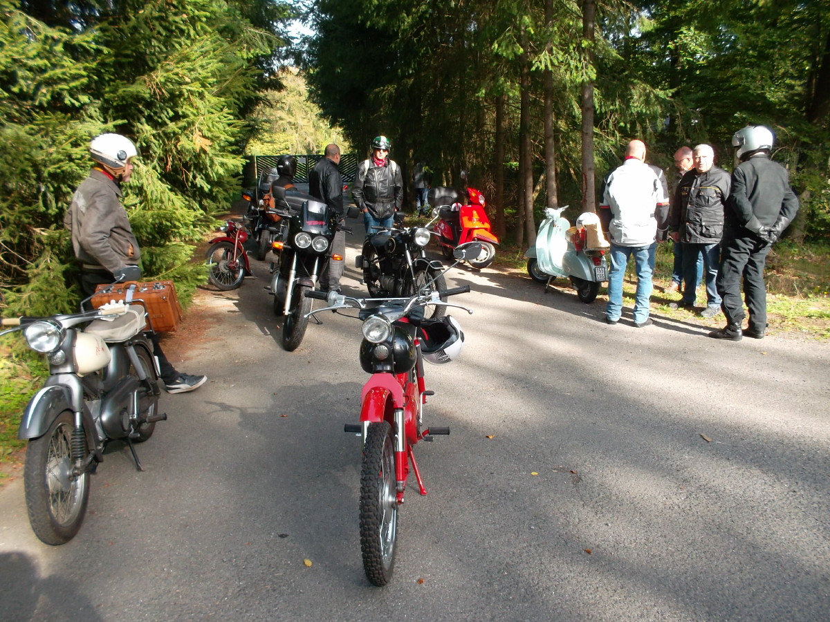 Sonntag, den 8. Oktober 2023 Wenn auch schon lange die meisten Teilnehmer mit Motorrädern erscheinen, die teils sehr viel mehr als nur 3 PS haben, so richtet sich das Tempo und die Beschaulichkeit nach Mopeds mit eben diese den Titel der Tour gebenden Leistungsangabe. Unser langjähriger Organisator der Tour hatte in diesem Jahr wegen umfangreicher anderweitiger Verpflichtungen keine Zeit, die Tour vorzubereiten. So sprang ich kurzfristig ein und führte die Runde über ca. 100 Kilometer an einige teils vergessene Relikte des Zweiten Weltkrieges vorbei. Wir konnten uns so einmal mehr bewusst darüber werden, dass der Frieden in unserem Land nunmehr schon mehr als 70 Jahre dauert und in Anbetracht des Krieges Russlands gegen die Ukraine konnten uns bewusst werden, dass dieses nicht selbstverständlich ist und wir uns um einen solchen ständig bemühen müssen. Zunächst war die alte Landebahn zwischen Straßfeld und Ollheim unser Ziel. Diese war einst in Beton ausgeführt und über drei Kilometer lang, weil der von den Deutschen entwickelte Düsenjäger Messerschmitt ME 262 nur mit einer sehr hoen Geschwindigkeit landen konnte. Von Hier aus kam diese Wunderwaffe nur versuchsweise gegen die Alliierten der Westfront gegen Kriegsende zum Einsatz. Danach nutzte die US-Air-Force die Landebahn für Ihre Nachtjägereinsätze gegen die Ruhrfront. Nach Kriegsende wurde die Anlage durch Bombardierung und Sprengungen von den Amerikanern zerstört. Der größte Teil der Bahn ist heute wieder Ackerland. Ein etwa einen Kilometer langes Teilstück ist indessen von Bäumen als Wald durchwachsen und schnell findet man darin noch die Betontrümmer der ehemaligen Landepiste. Diese schauten wir uns an. Danach führte der Weg an Odendorf vorbei, wo sich während des Krieges ein großer Feldflugplatz befand. Nur beim Feldzug gegen Frankreich 1940 war dieser strategisch im Einsatz, bestand aber bis Kriegsende und diente der Nazi- und Militärführung als Flugplatz für Besuche in der Region.