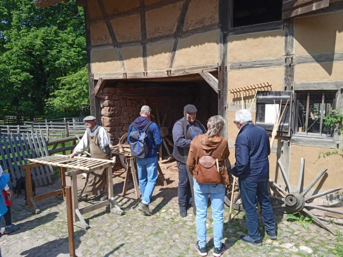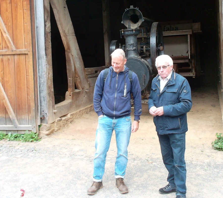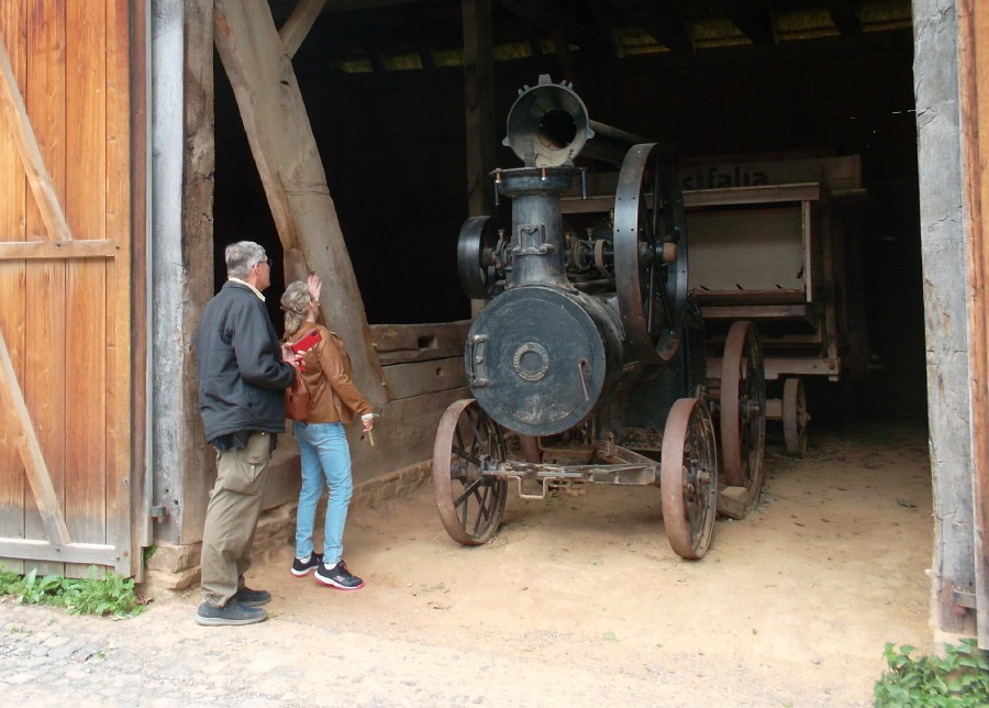 Mit dem Gang über das Gelände tauchten wir einmal mehr in die Vergangenheit ein. Volker stellte fest, wie sehr das Leben vor 150 und mehr Jahren sich doch von dem heutigen unterschieden haben muss, und zwar in fast allen Bereichen des täglichen Lebens: kein Strom, kein fließendes Wasser, viele Generationen auf wenig Wohnraum, Vieh, Schmutz und Hygiene. Fasziniert waren wir besonders dann, wenn es funktionale frühe Technik zu sehen gab, angefangen von der alten Schmiede, über das Werkzeug der Fassbinder über die gute alte Kutsche bis hin zum Lokomobil von Heinrich Lanz mit der angehängten Dreschmaschine.