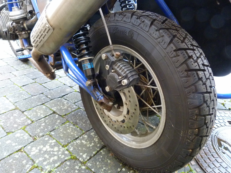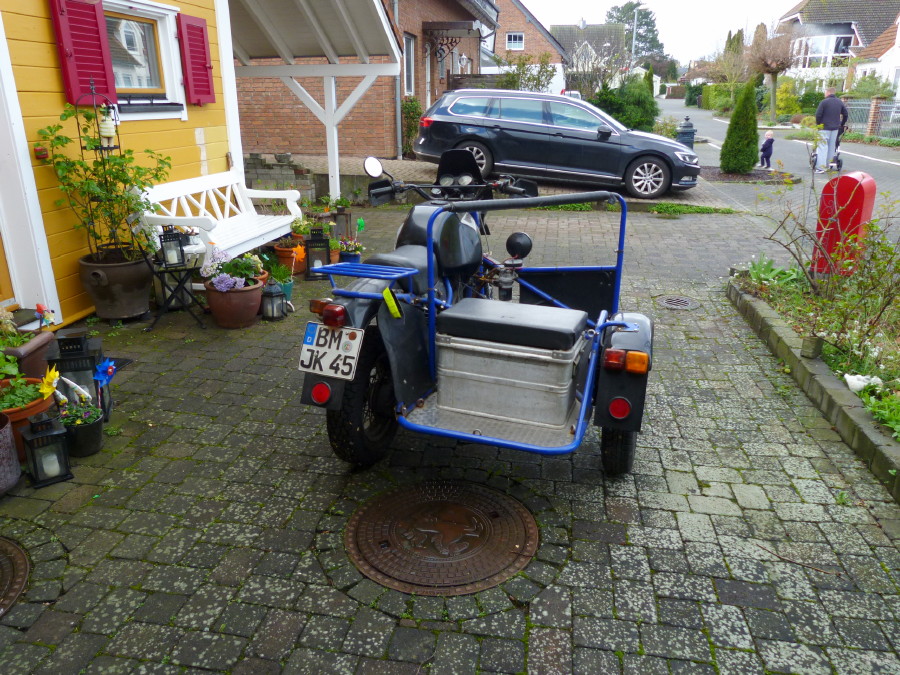 Der Wasp-Rahmen hat seine Wurzeln im Motocross. So verwundert es nicht, dass laut Fahzeugschein, das Motorrad ohne Beiwagen nicht gefahren werden darf und das komplette Gespann ohne Beifahrer auch nur mit einem Zusatzgewicht von mindestens 60 kg auf dem Beiwagen. Das Gesamtgewicht des gespanns beträgt laut Fahrzeugschein bescheidene 285 kg. Außer den aus dem Motocross bekannten Haltestangen für den Beifahrer findet sich auf der Beiwagenplattform eine große Kiste für die Aufnahme des Zusatzgewichts. Die simple wie clevere Lösung besteht darin, dass diese Kiste einen gepolsterten Deckel hat und insofern der Beifahrer auf längeren Fahrten darauf einigermaßen entspannt sitzen kann. Das ist für den allemal bequemer, als das Stehen, das nur mit Turneinlagen im Motocross Sinn macht, nicht jedoch beim Toureneinsatz auf der Straße. Von Nachteil ist bei dieser Konstruktion der mit zunehmender Geschwindigkeit wachsende hohe Luftwiderstand, der den Benzinverbrauch dramatisch steigen lässt. „Aber man kann ja schließlich nicht alles haben und das Fahren mit dem Wasp-Gespann machte schon viel Spaß“, bewertet Jochen diesen Umstand. |