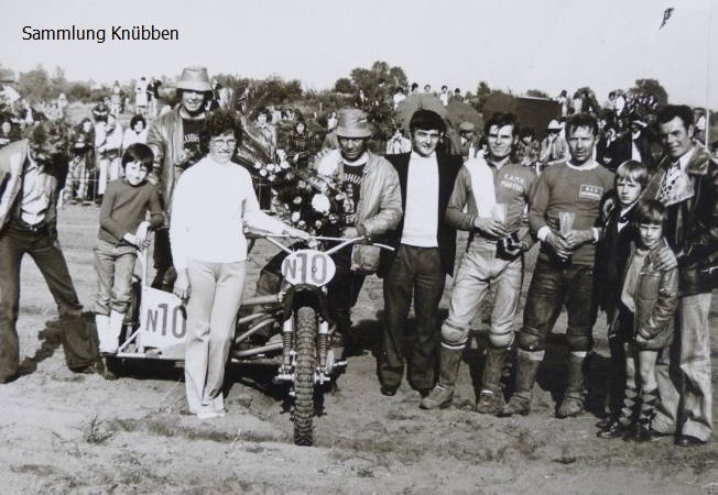 Und … „sagte nie ein Wort dazu“ Deshalb war es nur eine Frage der Zeit, dass Jürgen Knübben selbst auf der Rennstrecke am Lenker und am Gas drehte. „Für mich war klar: Ich fahre Motocross. Ich fahre nicht solo, ich fahre direkt Gespann!“, so Jürgen Knübben. Sein erster Gespann-Rennstart war 1977 mit 15 ½ Jahren bei einem Rennen des DAMCV in Roggendorf. Die Älteren erinnern sich sicher noch an diese Strecke, die mit all ihrem Sand und den Wellen (Waschbrettpiste) auch sehr gut nach Holland gepasst hätte: „Ich kam mit der Strecke bei dem ersten Rennen überhaupt nicht klar, hatte mehrere Stürze, wurde auch noch überrundet und beendete das Rennen weit abgeschlagen. Die eigenen Erwartungen waren sehr hoch, wen wundert das bei Jürgens noch junger Biografie, dementsprechend groß war jetzt die Enttäuschung. Und natürlich gab es da die vielen strengen Beobachter aus der Fan-Gemeinde seines Vaters: Auch die hatten sehr hohe Erwartungen und meinten nach dem Rennen enttäuscht zu diesem: „Ja Kunnes, das mit deinem Jungen, das gibt nie etwas!“ Diese Äußerungen bekam auch Jürgen von diesem „Fankreis“ zu hören. Sie machten alles nur noch schlimmer. Am Abend seines ersten Renntages stand Jürgen da, „wie am Boden zerstört“.