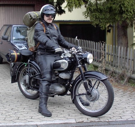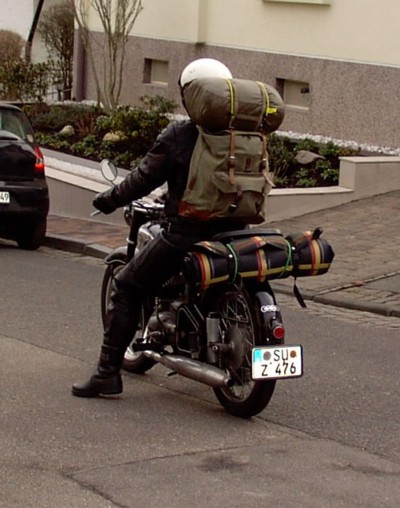 Hatten meine Eltern nicht immer erzählt, wie sie in den Fünfzigerjahren des letzten Jahrhunderts auf einer DKW RT 250 nonstop von Bonn nach Passau gefahren waren, um meine Großeltern zu besuchen? Und zwar über die B 8, da es eine durchgängige Autobahn damals noch nicht gab? Und daß die Bundesstraßen damals einen Ausbaustandard hatten, der heute zum Teil schon von landwirtschaftlichen Nutzwegen übertroffen wird? Wenn meine Eltern also über 600 km - fast 110 preußische Landmeilen - durch die finsteren, unwegsamen Mittelgebirgswälder von Taunus und Spessart, ständig bedroht von wilden, barbarischen Volksstämmen wie Hessen und Niederbayern bis ins ferne, sagenumwobene Passau gelangen konnten, dann mußte es mir doch möglich sein, mit einem Oldtimer 150 km durch die lieblichen, schon seit den Zeiten der Römer und Franken erschlossenen Kulturlandschaften von Rheinland und Niederrhein nach Kirchhellen, dem Tor zum Münsterland, zu fahren. Und so lieh ich mir das Veteranenmotorrad meines Bruders, passenderweise auch eine DKW RT (zwar nur mit 175 ccm Hubraum, aber schließlich fuhr ich ja auch solo), packte Schlafsack, Luftmatratze und Regenkombi in meinen Rucksack und begab mich mit viel gutem Mut und wenig schlechtem Kartenmaterial auf die Tour. Ich bin tatsächlich angekommen. |