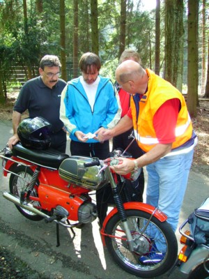 Sonntag, den 12.08.2007 Unterwegs mit höchstens 3 PS Nach einer verregneten vorausgegangenen Woche war das Wetter für die Ausfahrt wieder einmal ideal. Auf den Höhen hinter dem Siebengebirgel gab es ungetrübte Fernsichten. Insgesamt fanden sich 15 Teilnehmer auf Motorrädern mit maximal 3 PS ein. Junge Leute auf ihren modernen heute meistens Rollern ließen sich jedoch nicht ansprechen. Jüngster Teilnehmer war indessen Christian Blatt im Alter von 23 Jahren, dessen Kreidler nochmals ca. 10 Jahre älter gewesen sein dürfte. Die Jugendlichkeit kam dennoch nicht zu kurz. Wo immer der Schwarm mit ihren zumeist 50ern auch auftauchte, reckten die Passanten interessiert und begeistert ihre Köpfe. Sahen sie nicht nur interessante 98 ccm Motorräder aus einer ganz alten Zeit, viel erkannten auch die Mopeds, die ihnen selbst vor 30, 40 und noch mehr Jahren zu einem Mobilitätsschub verhalfen. Und auch die jungen Leute unter den Passanten reckten ihre Köpfe, sicherlich weil sie gleichaltrige erwarteten, die sie eventuell schon kannten. Aber auch diese staunten nicht schlecht. Die jenigen, die mit den alten Gefährten fuhren fühlten sich selbst in I(hre Jugendzeit zurückversetzt und dass müssen die Passanten auch bemerkt haben. Den Teilnehmern hatte die Tour jedenfalls wieder einmal Riesenspaß bereitet. Willi Schaub hatte sich bei den Vorbereitungen der Tour wieder einmal größte Mühe gegeben und so war auch dieser Erlebniswert auf höchstem Niveau. Die nachfolgenden Fotos konnte ich auch hier nur machen, wenn wir pausierten bzw. nicht mit dem Fahren befasst waren. Vielleicht lassen sie ja trotzdem etwas von der Stimmung der Teilnehmer erkennen. Sonntag, 12.08.2007 Hans Peter Schneider
