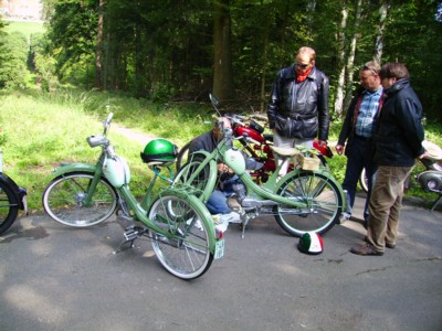 ... dennoch hatte eine der drei mitfahrenden Quicklys beim Breniger Berg ein Problem und musste den Besenwagen für den letzten Kilometer der offiziellen Tour nutzen. Da unser Quickly-Freund auf eigener Achse noch den Heimweg von Brenig nach Siegburg antreten musste, war natürlich eine Reparatur des Motörchens mit Bordmitteln erforderlich.