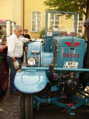 Kurzportrait Franz Josef Fröbus und sein Ursus Franz Josef Fröbus ist ein gebürtiger Brühler. In Brühl-Heide wuchs er eng verbunden mit der Vorgebirgslandwirtschaft auf. Sein Schlüsselerlebnis hatte er 1948, als er mehrfach auf einem Vorkriegs-Lanz-Bulldog mitfahren durfte. Das mächtige „... Bull - Bull – Bull ...“ des riesigen Einzylindermotors und die nicht weniger typische sich aus dem Motorcharakter ergebende Fahrdynamik hatten es ihm für den Rest seines Lebens angetan. Der Wunsch nach einem eigenen Bulldog verließ ihn nie. 2004 war es schließlich so weit, als er in Bayern einen teilrestaurierten Ursus erwerben und einen Jugendtraum verwirklichen konnte. Er vollendete die Restaurierung, sodass der polnische Nachbau des legendären Lanz-Bulldog sich heute in einem wieder neuwertigen optischen und technischen Zustand befindet. Zwar frönt Josef Fröbus auch heute noch sehr intensiv seinem Gartenhobby und freut sich besonders, wenn ihm der Salat und das Gemüse gut gewachsen sind, den Ursus braucht er jedoch ausschließlich zu Hobbyzwecken. So gehört Fröbus inzwischen auf allen regionalen Schlepperveranstaltungen mit seinem eindrucksvollen Ursus regelmäßig zu den umlagerten Attraktionen. Auch beim Spargelfest in Brühl zog er viel Aufmerksamkeit mit seinem Gefährt auf sich. |