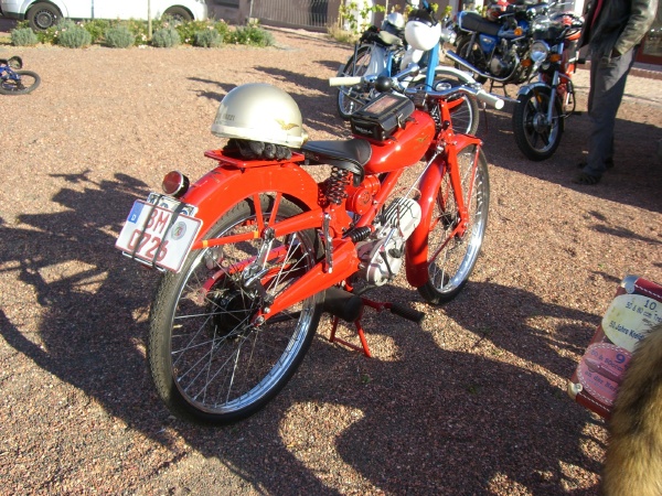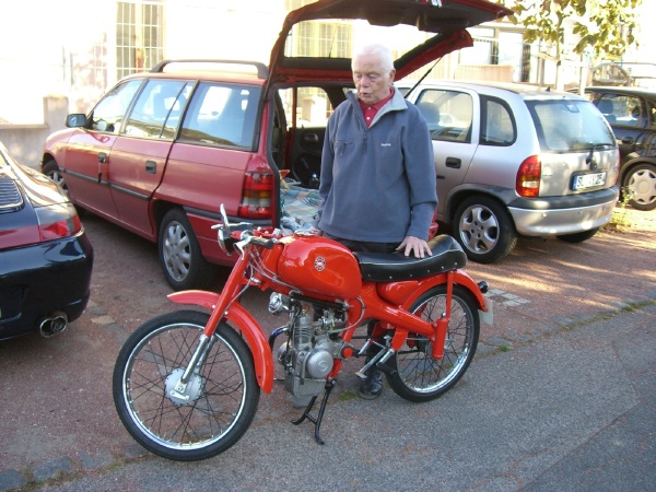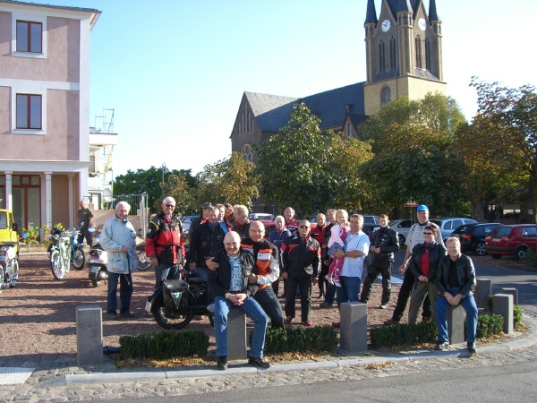 2011 Alle waren froh, dass die diesjährige 3-PS-Tour insgesamt zweimal verschoben wurde, denn schon Ende September zeichnete sich ab, dass das Wetter am 2. Oktober 2011 besser nicht sein konnte: Strahlend blauer Himmel mit sommerlichen Temperaturen, nur nicht so schwül wie die meisten schon vergangenen Sommermonate, dafür ohne unberechenbare Regenschauern. Die Zahl derer, die sich in Brenig zur Tour einfanden, war wohl deshalb mit 20 Personen auch relativ hoch. Arpad Schießl hatte sich zwei Tage zuvor auf dem Clubabend von Willi Schaub noch versichern lassen, dass auch wirklich ein Besenwagen mitfährt. Das ermutigte ihn dann doch so weit, die Tour sozusagen als Jungfernfahrt mit seiner frisch renovierten Kreidler zu nutzen. Bei einem ersten Testlauf der Kreidler einige Tage zuvor hatte der Motor gravierende Undichtigkeiten wegen eines verzogenen Gehäuses offenbart. Arpad hatte deshalb die Gehäusehälften Geschlichtet und wieder zusammengebaut und tatsächlich trat auch anschließend kein Öl mehr aus dem Gehäuse nach draußen. Das stimmte ihn hoffnungsfroh. Deshalb war er auch sehr gut gelaunt, als er sich am Treffpunkt auf dem Plon in Brenig einfand. Das der frisch zusammengebaute Motor viel Rauch durch den Auspuff schickte, führte Arpad da noch auf die Ölreste von der Montage zurück. „Den Hohlenberg ist sie trotz der nur 2 PS erstaunlich flott hinaufgezogen“, berichtete er freudestrahlend. Ich selbst hatte vor der Tour an meiner Quickly alles genau geprüft geprüft, geschmiert und genau eingestellt, um mir eine problemlose Teilnahme sicherzustellen. Am Treffpunkt stellte ich dann mit Schrecken fest, das auf dem Weg von Buschhoven über Alfter nach Brenig schon wieder eine Speiche in meinem Hinterrad an der Dickendkröpfung gerissen war. Auch bei meiner vorhergehenden Nutzung mit der Teilnahme an der Rallye in Brühl war schon wieder eine Speiche gerissen. Insgesamt war das jetzt das sechste Mal, obwohl die bei Krippl gekauften Nachbauten 0,35 mm dicker und damit anscheinend stärker sind, als die originalen. In meiner Jugendzeit hatte ich trotz Geländeeinlagen an meinen Quicklys nie ein Problem mit Speichenrissen. Ich war sauer und fragte mich, was mir denn der Krippl für einen Schrott als Speichen-Nachbau verkauft hat. Ich fürchtete, dass nach dem Fehlen einer Speiche bei einer Weiterfahrt bald noch weitere Speichen reißen oder gar das ganze Hinterrad zusammenbrechen wird. Aber die anderen machten mir Mut zum Weiterfahren und es sei ja auch für alle Fälle ein Besenwagen dabei. Na gut, lasse ich mich beruhigen. Ja der Besenwagen, der war zu dem Zeitpunkt