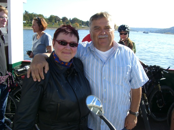 gewinnen konnte. Nach dem wir also reichlich gut gegessen und den Geist trainiert hatten, brachen wir auf zur nächsten Etappe. Arpads Kreidler, die den Weg bis Bad Breisig fürchterlich geraucht hatte wurde vor der Weiterfahrt vorsorglich gegen das Ersatzfahrzeug auf dem Besenwagen getauscht. Der Weg vom Lokaö führte direkt zur Fähre nutzten die Fähre nach Bad Breisig, die an diesem Tag von vielen genutzt wurde. In Bad Breisig ging es bald bergauf und über Unkelbach , Oedingen, Werthoven nach Wachtberg-Berkum. Dann blieben wir erst einmal auf der Höhe und schlugen den Weg über Meckenheim nach Heimerzheim ein, wo wir in einem Café den Ausklang einschließlich der Siegerehrung unseres Quizes begingen. Für eine korrekte Auswertung hatte zuvor Rolf Stauber mit beigetragen, der auf seiner Hompage selbst auch Fotos und ein Video der Tour zeigt. Die Links dazu finden sich weiter unten. Am Schluss muss ich noch danke sagen: