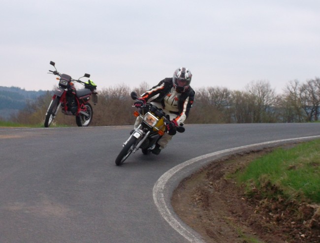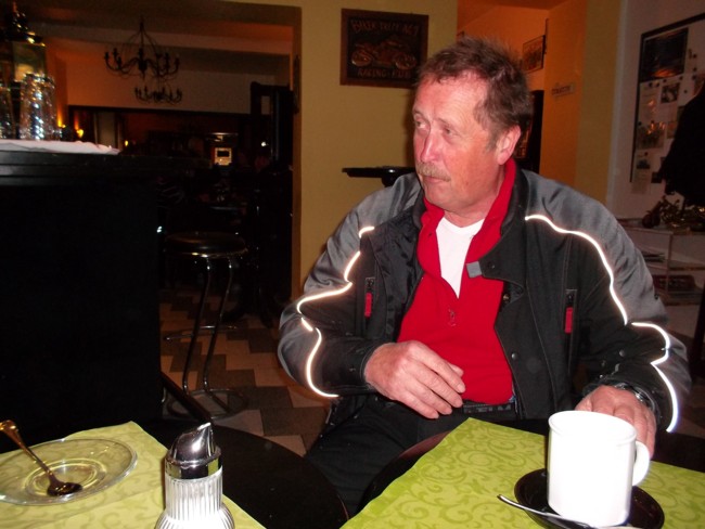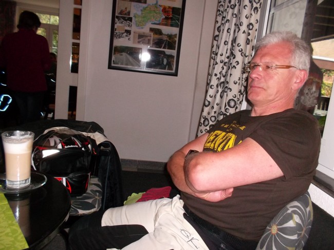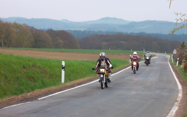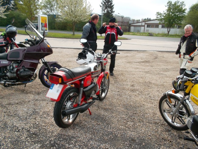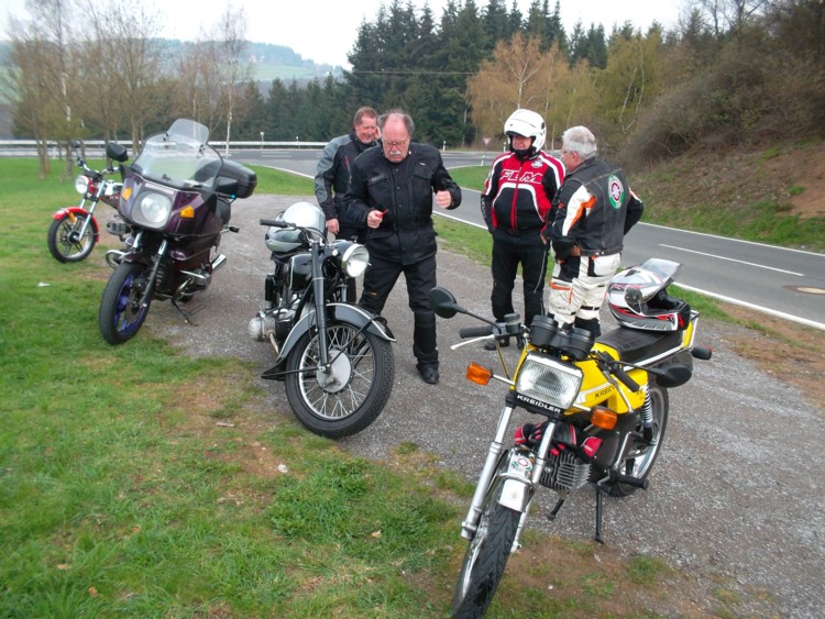 Die Erschienenen waren deshalb von der Anzahl nicht sehr groß, es war jedoch eine von den Fahrzeugen her sehr bunt gemischte Gruppe: Da war aus Köln zunächst Gerd mit seiner superstarken Kreidler, der noch gleich einen Freund mit einer ähnlich starken Kreidler mitgebracht hatte. Beide Kreidler waren keine echten 50er mehr und hatte reichlich Leistung, um bei einer 17-PS-Tour dabei sein zu können. Jedenfalls zeigte es sich im Laufe der Tour, dass Gerds Kreidler die gleichen Fahrleistungen erbrachte, wie meine Yamaha XT 350. Unser Freund Josef erschien mit einer BMW R 100 T, mit der er sich sehr gut auf das 17-PS-Tempo einstellen konnte. Schließlich erschien auch noch Michael mit einem richtig betagten Oldtimer, einer BMW R 51/2, die inzwischen etwa 60 Jahre alt war. Wenigstens wollte Michael bis mittags mit uns fahren, hatte aber am Nachmittag noch einen anderen Termin. Empfangen wurden die Teilnehmer vom Vorsitzenden Willi Schaub, sowie den Freunden Siegfried und Peter, die der Oldtimer-Motorrad-Szene sehr nahe verbunden sind und "eigens" zur Begrüßung der Teilnehmer aus Wilhelmshafen angereist waren.