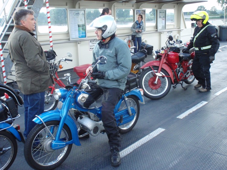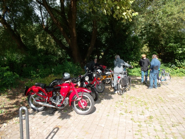 Die Tour führte diesmal durchs Flache, und zwar durch die Köln-Bonner-Bucht diesseits und jenseits des Rheins bis zur rheinischsten aller Städte nach Köln. Wer unterwegs schon die Augen aufhielt konnte rechts und links sehen, wie der Rhein noch vor wenigen tausend Jahres die Niederterrassenlandschaft geformt hatte. Der Rhein wurde zunächst mit der Mondorfer Fähre gequert. In Porz Zündorf machten wir einen Stopp, nutzten Die Zeit für eine konzertierte Reparaturmaßnahme an einer Hercules, der der Zündfunke zu schwach geworden war, schauten uns die Rheininsel an und stärkten uns mit deftiger und lieblicher Speise für den Rest der Tour. Dann ging es über Köln-Poll, nach Köln-Deutz und dort über die Deutzer Rheinbrücke bis zur nächsten Pause am Schokoladenmuseum, das allerdings nur von außen besichtigt wurde. Inzwischen hatte sich ein Problem an Kalles Honda als ein erstes gezeigt, das nicht mit Bordmitteln repariert werden konnte. Kalle fuhr damit jedoch ebenso tollkühn wie auch vorsichtig weiter bis nach Brenig. Dort fanden sich in Willis Werkstatt die Mittel für eine Notreparatur, denn Kalle hatte noch einen Heimweg von etwa 60 km vor sich und er sollte ja auch gut mit seiner Honda bis nach Hause kommen. Willi hatte mit seiner Idee, einmal nach Köln zu fahren die Teilnehmer einmal mehr überrascht und die Wetterhoffnungen wurden ebenfalls nicht enttäuscht. Gelegenheit zum Benzin-Sprechen gab es mehr als genug. Danke, lieber Willi. Swisttal, den 15.09.2013 |