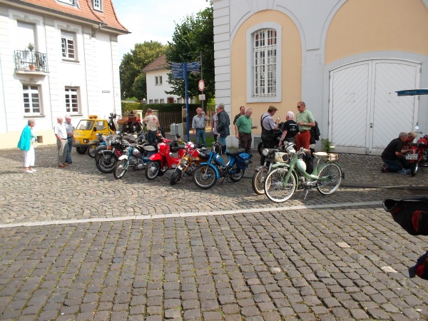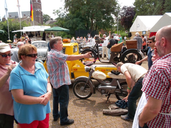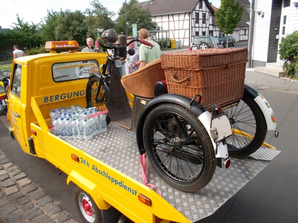 3. August 2014 So früh wie in diesem Jahr war die 3 PS-Tour noch nie und wegen der angesagten schwülen Hitze mit Gewitterisiko wollten wir auch nicht so schnell kneifen. Insgesamt 11 Teilnehmer fanden sich um 10:00 Uhr in Brenig ein. Erneut erschien Willi Schaub mit seinem sagenhaften Bergungsfahrzeug, das ihm einmal mehr freundlicherweise von der Fa. Reuter aus Roisdorf zur Verfügung gestellt wurde. Beladen war es mit einem Monet et Goyon Dreirad von 1925 – eigentlich zur Schau, damit viel Passanten ihre Freude daran finden konnten. Bunt wie immer war auch die Schar der altbekannten Freunde auf ihren kleinen Maschinen. Als erster der feurroten Italien-Fraktion war schon Dieter Mäder nach eigenen Angaben um 09:00 Uhr mit seiner 50er Motom erschiehen, und zwar zusammen mit unsewrem sehr treuen Freund aus Siegburg mit der grünen Quickly N. Dieter war wie immer, bestens gerüstet mit allen möglicherweise benötigten Utensilien in einem eindrucksvoll großen Tankrucksack. Damit der kleine Viertaktmotor der Motom auch nur ja alle seine sagenhaften 5 PS gleichmäßig und ohne springendes Rad ungestört auf die Fahrbahn bringen konnte, waren die Räder der Motom sorgfältig ausgewuchtet worden. Matthias und sein Freund Frank erschienen erneut mit wunderschönen Moto Guzzi Cavellinos, an denen man sich nicht satt sehen konnte. Leider streikte die Technik so weit, dass sie weitestgehend im Besenwagen transportiert werden mussten und Matthias - anders als geplant - mit der von Willi als Ersatzfahrzeug bereitgestellten Kreidler sich auf den Weg machen musste. Kalle kam einmal mehr von weit her aus der Nordeifel mit seiner Honda Dax und Mike sorgte mit seinem in in Deutschland nie verkauften Roller-Moped von Suzuki, den er aus Belgien importiert hatte, für einen weiteren japaniscvhen Beitrag im Teinehmerfeld. Gleich mehrere Kreidlerfahrer waren erschienen, allen voran unser treustes Clubmitglied Arpad. Erstmals dabei aus unserem Club war Rainer mit dem inzwischen relativ seltenen Zündapp Kleinkraftrad Falconette von 1960, bei dem die Hinterradbremse mit der Ferse bedient werden musste. Der erste Teil der Tour bestand weniger im Fahrerlebnis als viel mehr darin, gesehen zu werden, wozu die vielen Ampeln unterwegs reichlich Gelegenheit boten: Von Brenig über Bornheim führte der Weg zunächst auf direktem Wege nach Brühl, dort durch die Innenstadt bis vors Schloss Augustusburg, in dessen Schatten wir uns unsere erste Pause gönnten. Dann ging es weiter nach Hürth zum Otto-Maigler-See. Leider überraschte uns dort ein kräftiger Regenschauer, der auch zum Gewitter noch hätte mutieren können. Wir beschlossen deshalb kurzerhand, die Tour in Anbetracht der sich zeigenden Wetterdramatik twas abzukürzen. Der Besuchspunkt in Frechen wurde kurzerhand gestrichen und stattdessen als direktes Ziel Friesheim angesteuert, wo an dem Tag ein Oldtimertreffen stattfand. Durch Brühl fuhren wir noch im Regen. Nachdem wir den Bleibtreusee erreicht hatten, ließ der Schauer nach und auf Höhe des Liblarer Sees war die Straße gar wieder ganz trocken. Als wir etwa 10 Minuten später in Friesheim ankamen war der Regen gar schon fast wieder vergessen. Beim Oldtimertreffen des örtlichen Karnevalsvereins waren bereits zahlreiche schöne und interessante Autos vorhanden. Mit unserem Erscheinen kam natürlich der Zweiradbeitrag der Veranstaltung deutlichen Zuwachs. Wir stärkten wir uns dort bei Essen und Trinken, erfreuten uns an den vielen schönen Oldtimern und der Musik der 1950er und 1960er Jahre. Als gegen 15:00 Uhr der Himmel nahm schon wieder Anstalten machte, sich zu verfinstern, machten wir uns auf den Heimweg. Willi hatte Wort gehalten: Es war diesmal eine Tour ohne viele Höhenunterschiede. Fürs nächste Jahr versprach mir Willi schon, Ampeln möglichst zu meiden. Im Übrigen sei das Album mit einigen Foto-Impressionen empfohlen |
