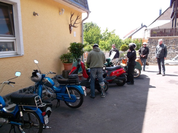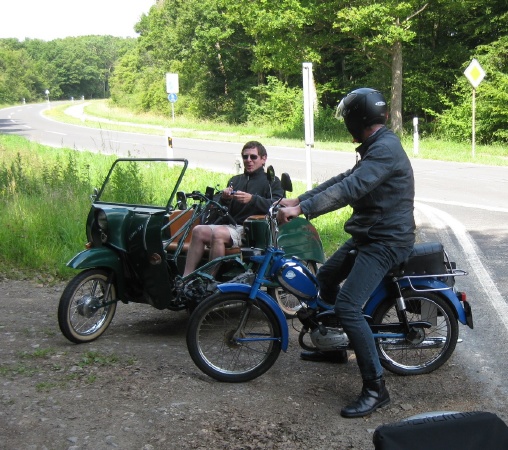 22. Juni 2014 Das Wetter konnte idealer nicht sein an dem Tag: Trocken mit sonnigen Abschnitten und so um die 20° C, dazu noch eine hervorragende Fernsicht. Zudem hat man auf einem relativ langsamen Moped auch noch viel Gelegenheit für Blicke nach rechts und nach links. Die sechs Teilnehmer erwiesen sich als ideale Besetzung und keine der kleinen Maschinen machte trotz der teils erheblichen Höhenunterschiede schlapp. Bemerkenswert ist in diesem Zusammenhang einmal mehr unser Freund Kalle. Sein rechter Fuß war wegen einer Verletzung vom Arzt stillgelegt worden und steckte deshalb in einem klobigen Spezialschuh. Weil er damit nicht bremsen konnte, ließ er seine Honda Dax stehen und lieh sich von seiner Tochter kurzerhand den Roller, mit dem er morgens die 60 km von Hürtgenwald bis Brenig fuhr, an der ca. 120 km weiten Tour durch die Ahr-Eifel teilnahm und anschließend auch wieder bis nach Hürtgenwald nach Hause fuhr. Alle Achtung! Wir hatten deshalb auch alle kein Problem damit, mittags eine 10-minütige Pause einzulegen, damit er über sein Smartphone bei einem bekannten Auktionshaus in England noch schnell erfolgreich Rückleuchten für seinen alten Lotus ersteigern konnte. Wir alle freuten uns anschließend mit ihm. Nun die Tour war einfach schön: Kuven, Landschaft und viele Passanten die fröhlich guckten, wenn wir vorbeifuhren. Besondere Attraktionen waren Joerg aus Köln mit seinem DUO 4/1 und Mike aus Sechtem mit seinem Piagio-Roller-Gespann. Der DUO war der motorisierte Krankenfahrstuhl aus der ehemaligen DDR auf Basis der Simson Schwalbe. Jörg hat diesen gründlich restauriert: Neuer Lack, Räder wie neu, Kabel und Züge sauber verlegt, umgebaut zum Cabrio-Roadster und der Simson-Motor musste dem aus einem neueren Zweitaktmotor nebst Antrieb aus einem Roller weichen. Manch einer mag das als Stilbruch betrachten, aber der Motor war ja ohnehin nur der Antrieb für den Fahrstuhl, hatte Getrenntschmierung und ein Automatik-Getriebe. Dem TÜV gefiel das Gefährt gab seinen Segen dazu. Den Passanten gefiel das Gefährt mit den drei Speichenrädern ebenfalls, weshalb sie zum Gucken stehen blieben .Trotz bis zu 14 % Steigungen und Gefälle geriet Jörg damit nie ins Hintertreffen. Mike, den wir ja schon oft auf außergewöhnlichen Zweirädern sitzen sahen, war zur Tour ebenfalls auf drei Rädern erschienen, An seinen 125er Piagio-Roller hatte er vor einigen Jahren bereits einen kleinen Kalf-Beiwagen gehängt. Eine in der heutigen Zeit ungewöhnliches Bild der Leichtigkeit auf drei Rädern. Klar war Mike damit der schnellste unserer Gruppe. Arpad war indessen mit seiner wunderbaren Kreidler Florett aus den frühen 1960er Jahren erschienen, ein Augenschmaus für alle Kenner der Szene, weil sie eben so restauriert war, als sei sie eben erst vor 500 km neu erworben worden. Wer den Arpad nicht kennt, wird kaum glauben, dass der seine Oldtimer quasi aus Schrott wieder zu neuem Leben erweckt und zum Laufen bringt. Unser Freund Peter aus Impekoven hatte bei dieser Ausfahrt seine Schwalbe zu Hause gelassen und fuhr mit seinem Hercules Moped. Für ihn war es mal ein Test, wie sich sein Neuerwerb wohl bei einer so durchaus technisch anspruchsvollen Tour schlägt. Das Moped hatte den Test bestanden, was ihn erfreute. Nichtsdestotrotz will er in Kürze noch einige verschlissene Teile an dem Moped austauschen. Meine kleine Zündapp C 50 Super brannte den ganzen Weg bergauf und bergab problemlos wie eine giftige kleine Wespe. Wohl keines meiner Motorräder ist so laut, wie diese kleine Zündapp von 1975 mit ihrem Originalauspuff. Seit nunmehr 2.000 km läuft sie nun schon und ich brauchte immer nur zu tanken.