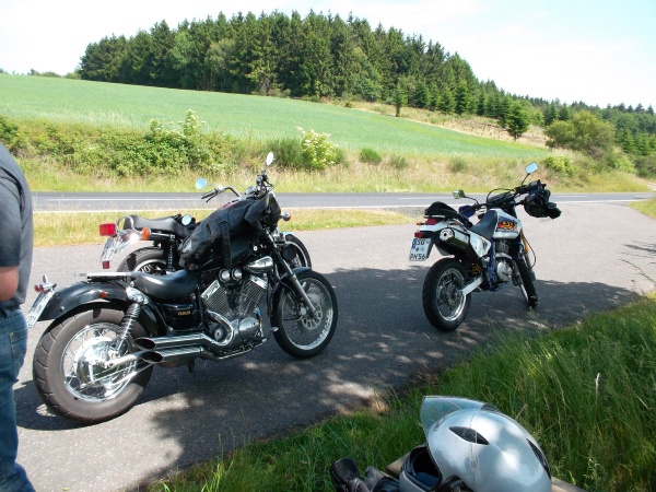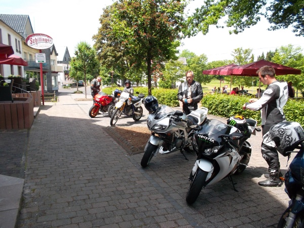 den 09. Juni 2014 Mit dem Wetter ist es ja nie so einfach oder es geht uns so gut, dass wir schon so sind, wie die Bauern, die bekanntlich meistens mit dem Wetter unzufrieden sind. Entweder es regnet oder es ist Bullenhitze. Am Tag der Tour waren diesmal schwüle Temperaturen über 30° C angesagt und die stellten sich auch ein. In Anbetracht der absehbaren heißen Herausforderung verständigten sich die Erschienenen auf meinen Vorschlag hin, die Tour etwas verkürzt zu fahren und dafür mehr erfrischende Pausen einzulegen. Einer traute sich sich nach einer vorausgegangenen langen feuchtfröhlichen Nacht nicht die erforderliche Fitness zu und trottete deshalb mit seiner Moto Guzzi Grisso nach Hause, als unsere gut gelaunte Gruppe sich in Richtung Osteifel anschickte.Von den fünf Erschienenen hatten sich also die härtesten vier zur bisher heißesten Tour dieses Jahres auf den Weg gemacht und das alle durchweg auf echten Youngtimern. Informationen um Vulkanismus, dem früheren und dem aktuellen und Hinweise für die Weiterfahrt gab es am ersten schon vielfach bewährten Treffpunkt mit Blick auf die Olbrück. Im Übrigen führte der Weg wieder über vornehmlich kleine Sträßchen, die stimmungsvolle Ansichten der nunmehr in der Hitze flirrenden Eifellandschaft boten. Wie angekündigt, wurde flott gefahren. Inzwischen bin ich vollends davon überzeugt, dass kaum jemand flotter mit einer Yamaha Virago in der Eifel unterwegs sein kann als unser Freund Kalle aus Hürtgenwald. Den Grund hierfür erklärte er bei der verspäteten Mittagsrast in Kelberg: „Die Virago bekommt regelmäßig Viagra“. Nun denn, wir werden eben alle nicht jünger. Das Schmuckstück unter den Tourteilnehmern fuhr ohne jeden Zweifel Wilhelm aus Impekoven mit einer Moto Guzzi 1100 Sport. Nicht nur, dass am Café in Kelberg viele Passanten an dem roten Motorrad stehen blieben fasziniert guckten, auch die Tourteilnehmer freuten sich in jeglicher Hinsicht an dem schönen Motorrad in ihrer Reihe. Aus uns immer noch nicht erklärlichen Gründen ging uns unterwegs jedoch unser Freund mit seiner Honda CX 500 Custom verloren. Es muss bei einer Begegnung mit einer anderen Gruppe Motorradfahrer zu Verwechselungen gekommen sein, wer denn hinter wem herzufahren hat. Aber schon während der verspäteten Mittagsrast in Kelberg konnte Kalle mit seinem Handy Funkkontakt zum Verschollenen finden – was in der Eifel gar nicht so einfach ist - und so erfuhren wir, dass er währenddessen im etwa 25 km entfernten Mayen gelandet war.