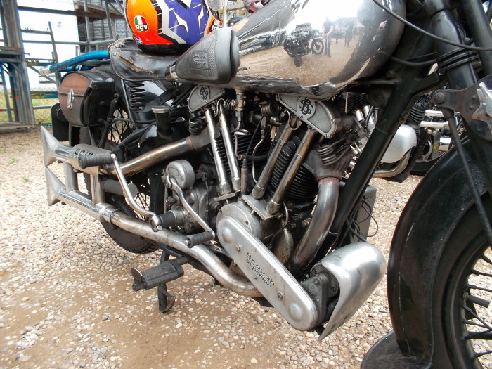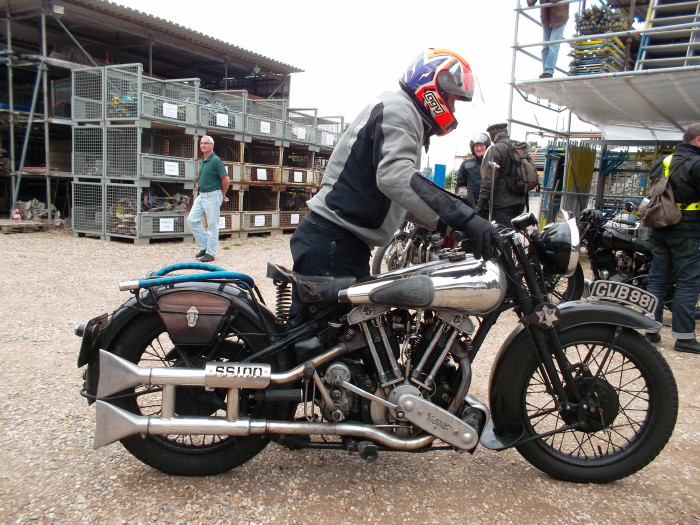Um 16:15 Uhr trafen sie in Waldorf ein, angeführt von Josef Werhahn auf einer Vorkriegs Boxer-BMW als Touren-Guide. Im Gefolge fuhr sodann mit dem Donnergrollender großvolumiger Motorradmotoren der gesamte Hochadel des englischen Motorradbaus auf den Hof von Schaubs Firmengelände: Die schnellen SS80 und SS100 waren dabei und gleich mehrere der von Brough-Superior komplett gebauten Gespanne, teils mit seitengesteuerten robusten V-Motoren von JAP. Nun waren sie also da. So viele Motorräder dieser Marke hatte ich noch nie in meinem Leben gesehen und war mit der Besonderheit dieses Augenblickes bewusst. Zusammen mit den anderen nahm ich mir natürlich sogleich diese höchst seltenen und kostbaren Motorräder nebst ihren Fahrern in Augenschein. Es stellte sich dabei heraus, dass die erschienen Clubmitglieder international zusammengesetzt waren und nur ein Teil von diesen von der britischen Insel angereist war. Teilnehmer kamen auch aus der Schweiz, den Niederlanden und - ganz einfach - aus Deutschland. Alle waren Sie sehr nett und freundlich. Man unterhielt sich gut bei einem Getränk und einer Kleinigkeit zum Essen.