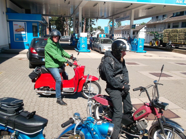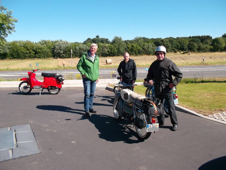 Sonntag, 1. Juli 2018 Vier gut gelaunte Teilnehmer mit Ihren alten Mopeds am vereinbarten Treffpunkt in Buschhoven ein. Das Wetter war ideal: Es war zwar heiß aber nicht schwül und die Natur zeigte sich in satten Sommerfarben bei bester Fernsicht. Die Gegend rund um Mechernich ist vielen nicht so bekannt. Die meisten kennen die am Rande der Eifel liegende Landschaft nur vom Durchfahren in die Nord- oder Zentraleifel. Genau betrachtet, liegt Mechernich am Eifelrand: Die flache Zülpicher Bördenlandschaft geht hier zunächst leicht hügelig weiter gen Westen Westen hin immer steiler werdend in die Eifelberge über. Die Geologen sprechen von der Mechenicher Triasbucht, die im frühen Erdmittelalter vor ca. 240 Mio. Jahren entstand und heute die für dieses Erdzeitalter charakteristischen Gesteine auweist: Da ist zunächst der „Buntsandstein“ zu nennen, ein roter Sandstein, deren bekanntesten Vertreter die „Katzensteine“ im Veytal sind. Dann der „Muschelkalk“, ein Kalkstein mit hohem Anteil versteinerter Muscheln (Kakushöhlen bei Eiserfey) und schließlich der „Keuper“, ein mergeliges rötliches Gestein, das den heutigen Böden um Mechernich und Kall die rötliche Färbung gibt.