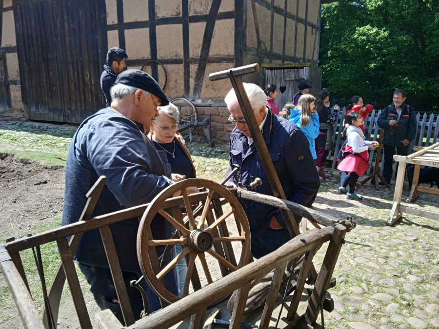 Mit dem Gang über das Gelände tauchten wir einmal mehr in die Vergangenheit ein. Volker stellte fest, wie sehr das Leben vor 150 und mehr Jahren sich doch von dem heutigen unterschieden haben muss, und zwar in fast allen Bereichen des täglichen Lebens: kein Strom, kein fließendes Wasser, viele Generationen auf wenig Wohnraum, Vieh, Schmutz und Hygiene. Fasziniert waren wir besonders dann, wenn es funktionale frühe Technik zu sehen gab, angefangen von der alten Schmiede, über das Werkzeug der Fassbinder über die gute alte Kutsche bis hin zum Lokomobil von Heinrich Lanz mit der angehängten Dreschmaschine.