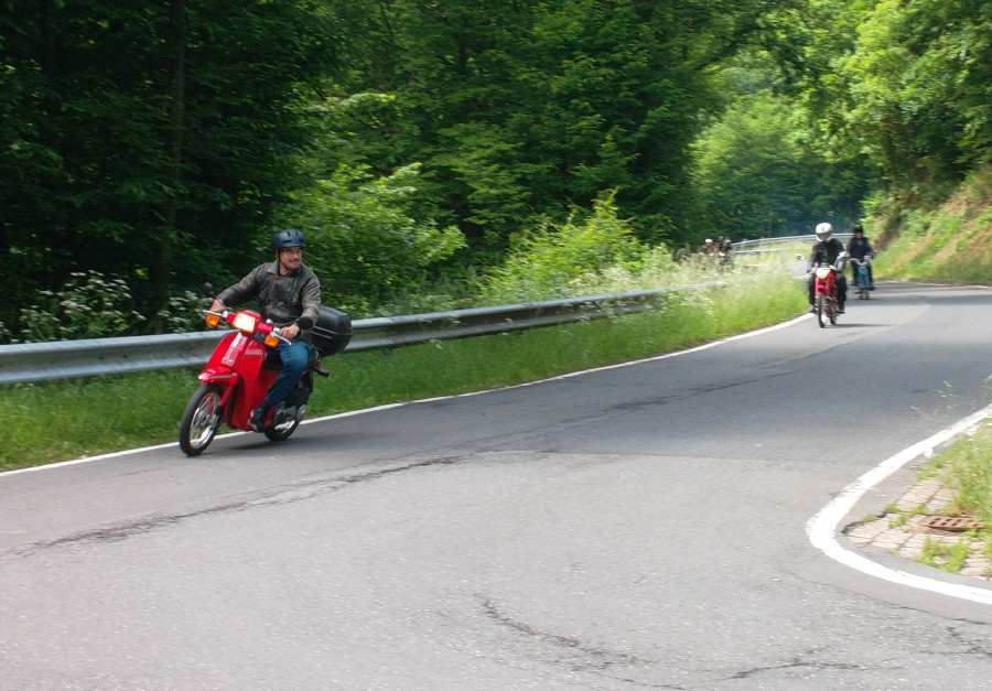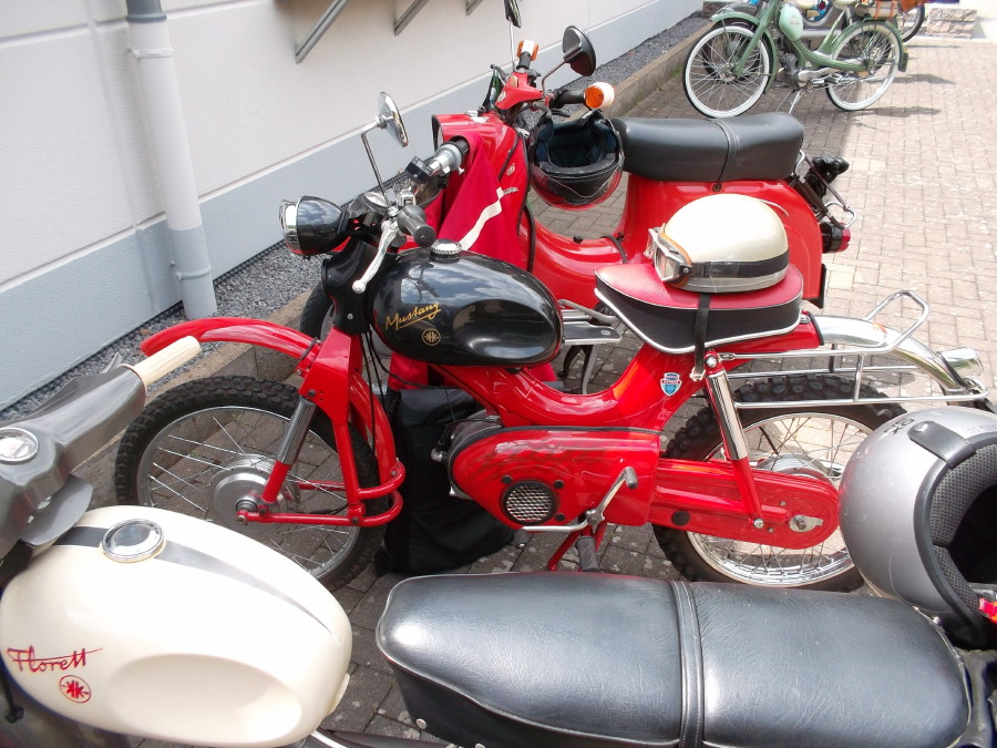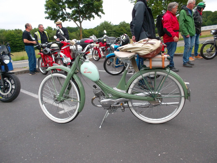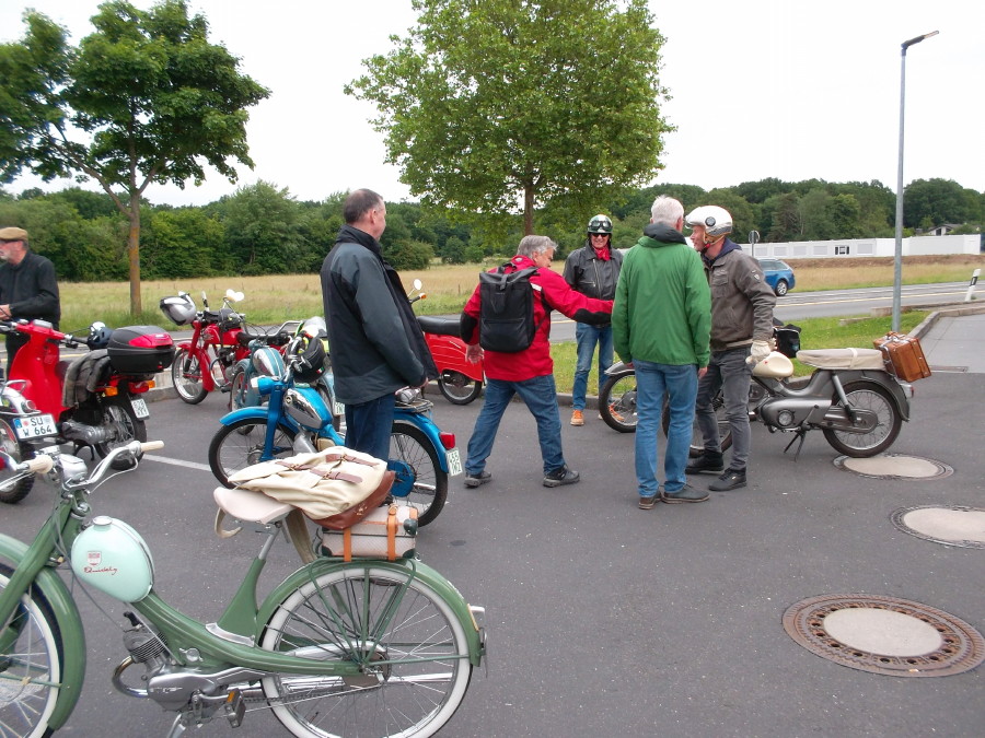 In Hönningen kehrten wir im Café Fahrtwind ein und stärkten uns mit Kaffee und Kuchen. Bei der Gelegenheit verehrte unser Vorsitzender den Teilnehmern mit den ältesten Fahrzeugen Teller mit Motiven der Rennstrecke „Schleizer Dreieck“ zum Aufhängen. Frisch gestärkt fuhren wir schließlich im Liersbachtal durch durch Natur und nichts als Natur. Wohl dem, der in dieser Zeit nicht unter einer Gräserpollenallergie litt. Am Ende des Tals windet sich kurz hinter Obliers die Straße in vielen engen Serpentinen steil bis auf das Höhenniveau von Plittersdorf. Für Mannis Quickly war das die wohl größte Herausforderung an diesem Tag, Aber mit einem ersten Gang war das für das bald 70 Jahre alte Moped Dank hervorragender Pflege und Liebe kein redenswertes Problem. Über Scheuren und Rheinbach landeten wir schließlich nach ca. 80 Kilometern und um viele Fahreindrücke reicher gegen 15:45 Uhr in Buschhoven, von wo aus ein jeder seinen Heimweg antrat. Bereits in Hönningen hatte die Sonne die vielen Wolken weitgehend verdrängt, sodass am Ende die anfänglichen Regensorgen ganz verflogen waren. Hatte der Wetterbericht also Recht gehabt.