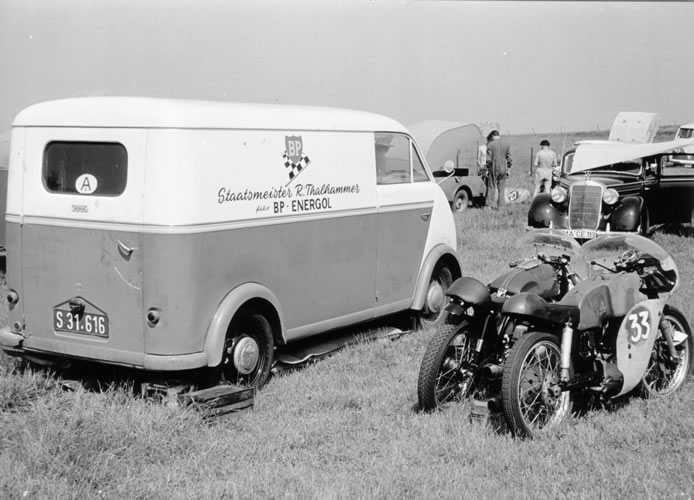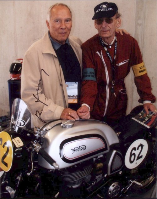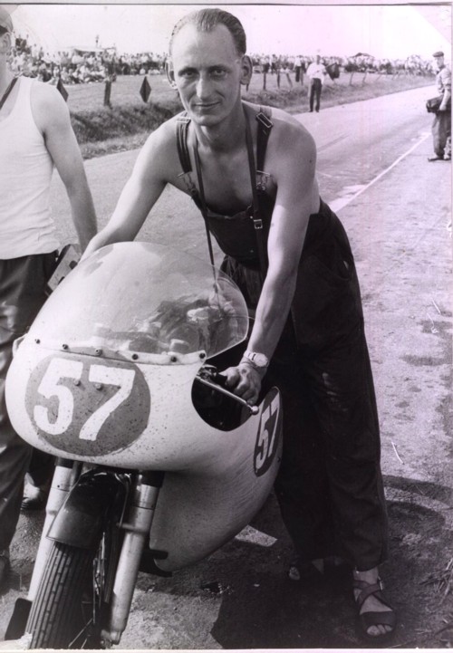 Abenteuer mit Rudi Thalhammer Ich frage Karl Schleuter, wie er denn dazu gekommen sei, sich der Fotografie des Motorradrennsportes so sehr zu verschreiben? Das komme doch nicht, ohne bewegende und faszinierende Erlebnisse zustande und welche Erlebnisse denn dazu in seiner Rückschau den Ausschlag gaben. Darauf Schleuter: „Der Straßenrennsport mit dem Fahren am absoluten Tempolimit, die Fahrer und die Dramatik dieses Sportes überhaupt sind es, die mich zum Motorrad-Straßenrennsport führten, meine damalige Unterstützung des Österreichers Rudi Thalhammer und die Fahrkünste des schottischen Rennfahres Bob McIntyre waren es, die mich erstmals zur Isle of Man gebracht hatten, wo ich über die TT-Races meine zweite Heimat fand. Das Fotografieren interessierte mich schon immer und so verband ich das mit meiner Begeisterung für den Motorradrennsport“. Dann berichtet er mir von dem Österreicher Rudi Thalhammer: Dessen Eltern eine Käsefabrik in Österreich hatten. „Eines Tages wollten die Eltern sich zurückziehen und übergaben die Käsefabrik an ihre Söhne, eben an Rudi und seinen Bruder. Während Rudis Bruder die Käserei fortführte, gab Rudi sich seiner Begeisterung für den Motorradrennsport hin. Schließlich hatte der sein gesamtes beträchtliches Vermögen in diesen Sport gesteckt und wurde mehrfacher staatsmeister in seinem Land". Karl Schleuter traf Rudi Thalhammer schon in den 1950er Jahren. Die beiden verstanden sich auf Anhieb gut und schon bald unterstützte Schleuter Rudi Thalhammer als Helfer im Fahrerlager, vor allem auf dem von Bonn aus nahe gelegenen Nürburgring und im holländischen Assen. Bei der TT in Assen, am 27.06.1959, musste Schleuter erleben, wie Thalhammer beim ersten Trainingslauf „in die Strohballen flog, die zur Streckensicherung in der Strubben-Kurven lagen". Thalhammers Motorrad fing dabei Feuer, aber es war keine Feuerwehr vor Ort, die das brennende Motorrad hätte löschen können. Am Ende blieb von dem Motorrad – einer NSU-Sport-Max - ein verkohlter Metallhaufen übrig. Jeder andere Mensch hätte an Thalhammers Stelle diese Überreste eingepackt und wäre wieder nach Hause gefahren. Nicht so Thalhammer: „In eineinhalb Tagen hatten wir das Motorrad wieder neu aufgebaut und erst nachdem Thalhammer damit eine Probefahrt absolviert hatte, entschloss er sich, beim 250er Rennen an den Start zu gehen. Nach dem Rennen fuhr ich ihn in das Assener Krankenhaus, denn außer den Prellungen und Hautabschürfungen von dem Sturz klagte er über starke Unterleibsschmerzen unten rechts. Im Krankenhaus stellte man als Ursache für die „inneren Schmerzen“ aber keine Sturzfolgen fest, sondern eine Blinddarmentzündung. Damit war für Thalhammer ein Krankenhausaufenthalt angesagt. Immerhin war das Motorrad so weit wieder startklar." Für den 12.07.1959 – also zwei Wochen nach Assen - stand in jedem Fall die Teilnahme am Rennen auf dem Nürburgring auf dem Plan. Schleuter nahm deshalb Thalhammers Motorrad und sein komplettes Rennequipment zunächst in seine Obhut und brachte alles am folgenden Tag zum Krankenhaus. Am Nürburgring erschien Thalhammer pünktlich zum Training und Rennen. „Der ist einfach aus dem Krankenhaus laufen gegangen“, lacht Schleuter heute noch. Solcher Ehrgeiz war und ist im hochkarätigen Rennsport keine Seltenheit. Das Rennen der 250er Klasse beendete Thalhammer anschließend als Sieger. Für ihn hatte sich das insoferen gelohnt. |
